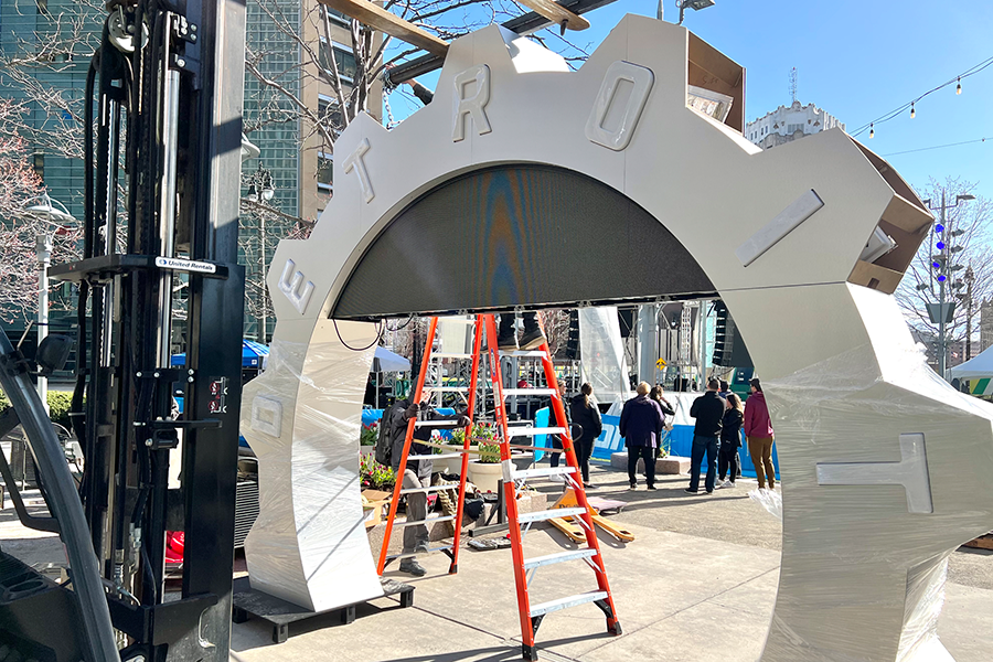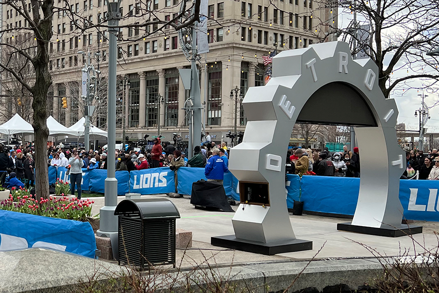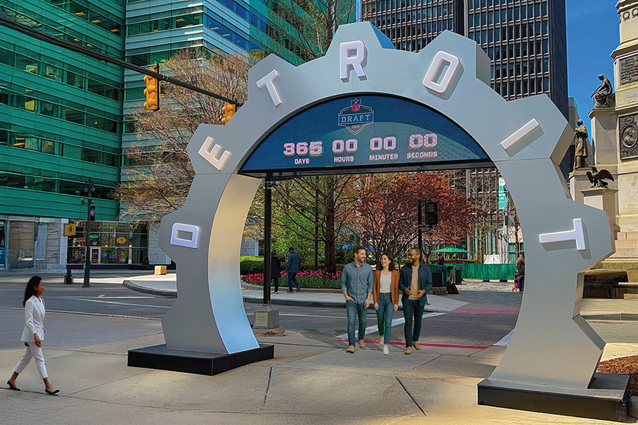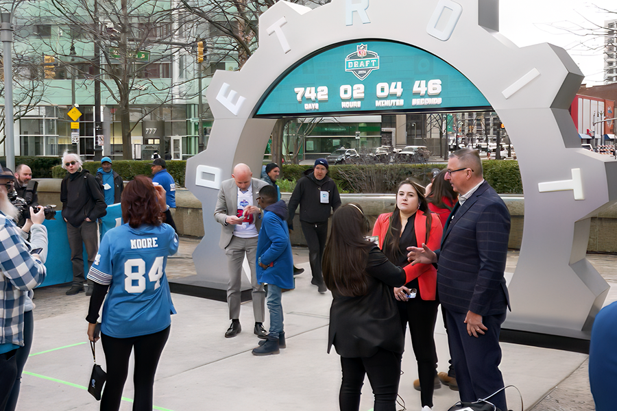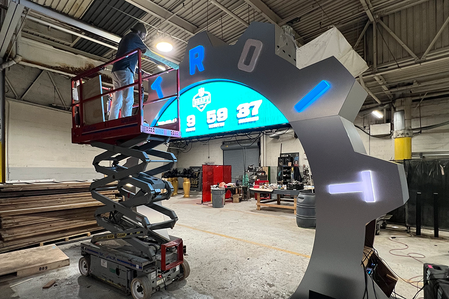 Display Group partnered with the NFL and the Detroit Sports Commission to bring the countdown clock to life. Our Custom Fabrication team worked from early concepts through final installation, turning an idea into a large scale public structure built to live outdoors in the heart of downtown. The process involved engineering for wind and weather, structural planning, material testing, fabrication, finishing, and careful coordination with city partners to install it safely and on schedule.