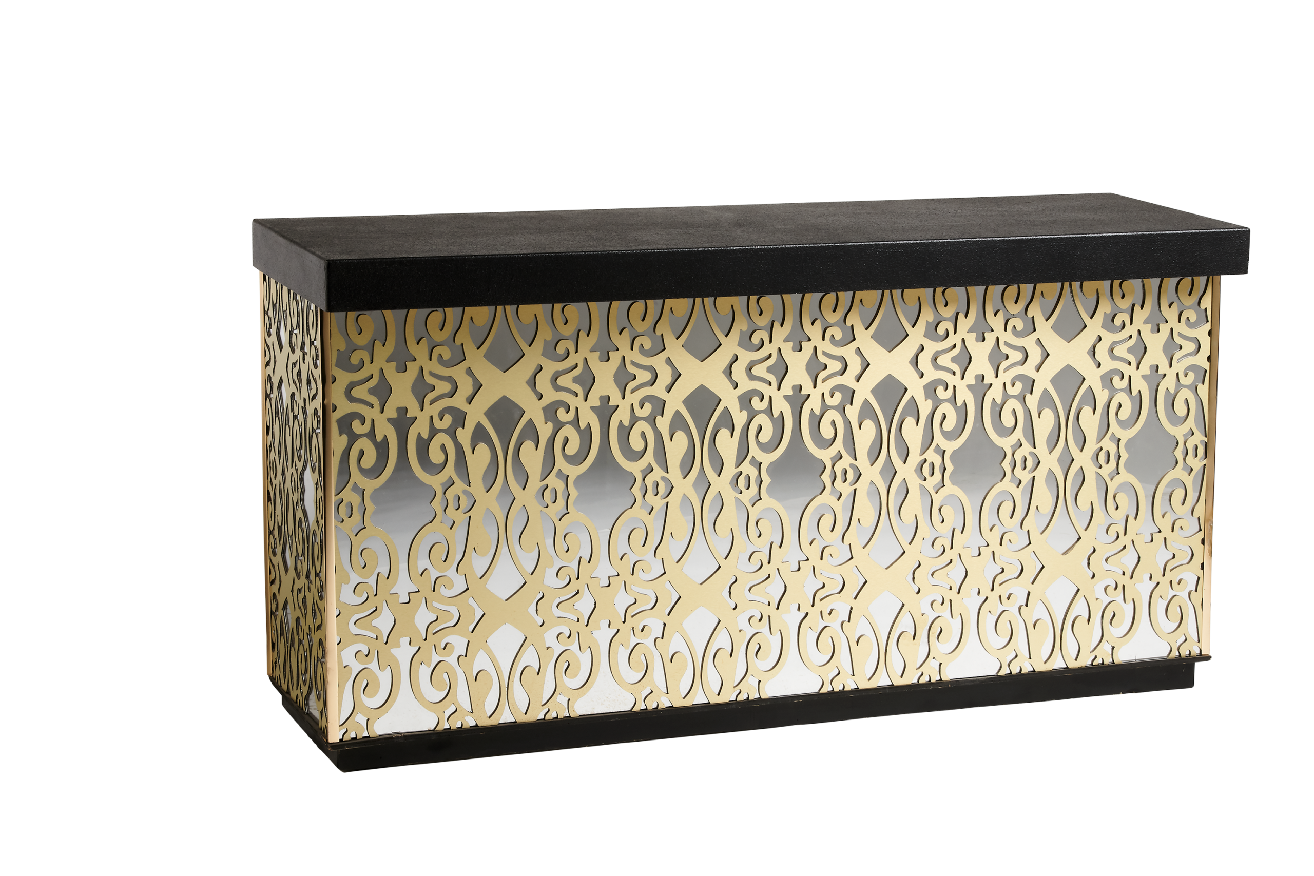 Display Group’s Avenue 4′ Black Velvet Bar provides inner shelving and liquor bottle troughs.