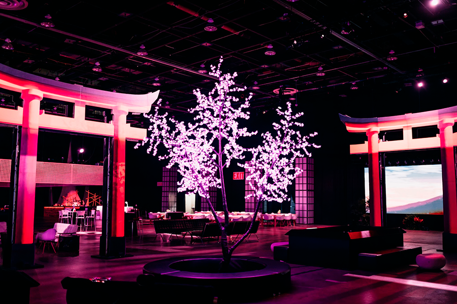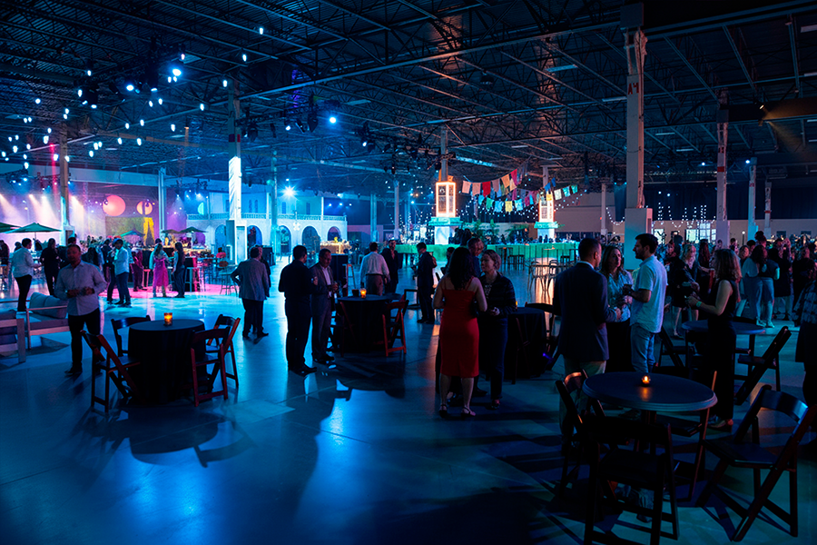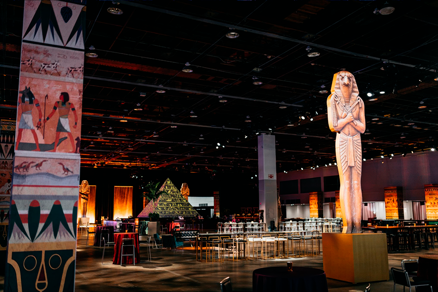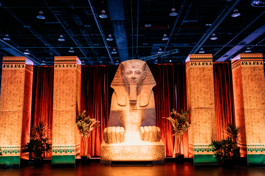 It all began with a global tour in 2021, where UWM invited guests to explore four dramatically different cultural environments inside Huntington Place. Guests checked in at a fully themed “airport” registration area before stepping into rich recreations of Egypt, Antarctica, Japan, and Brazil. Our fabrication team delivered oversized scenic elements like towering Egyptian statues and authentic torii gates, while our AV team handled concert-level lighting and audio for a headlining national music act.