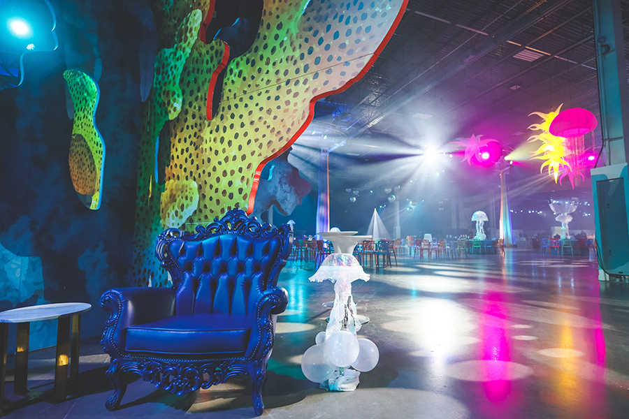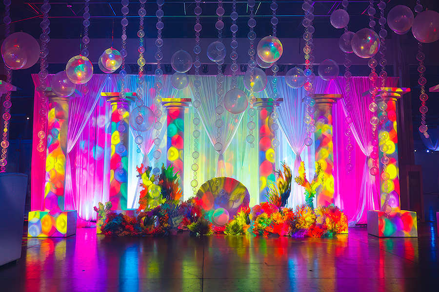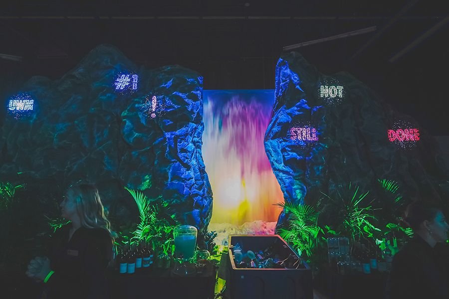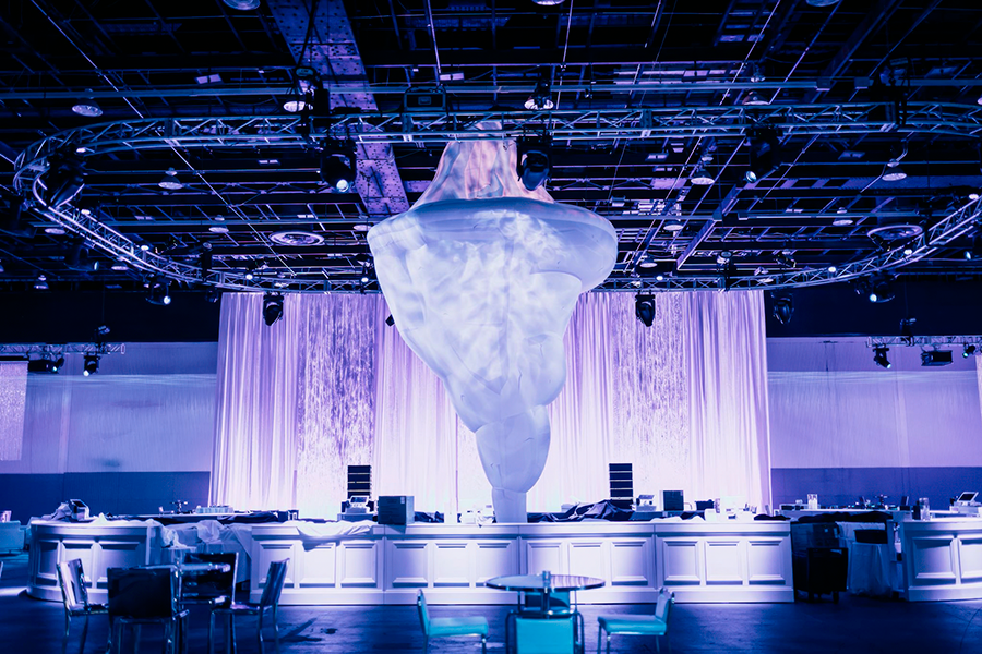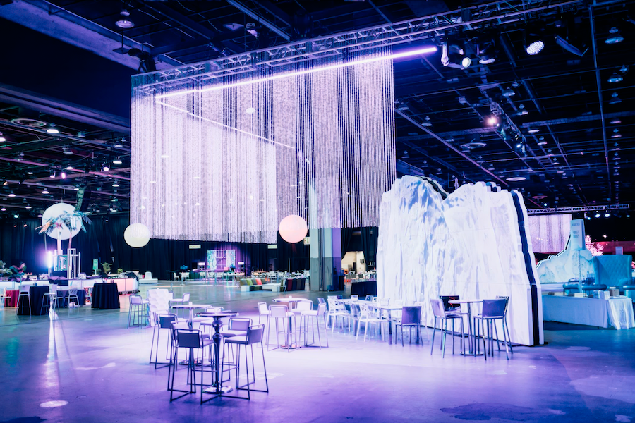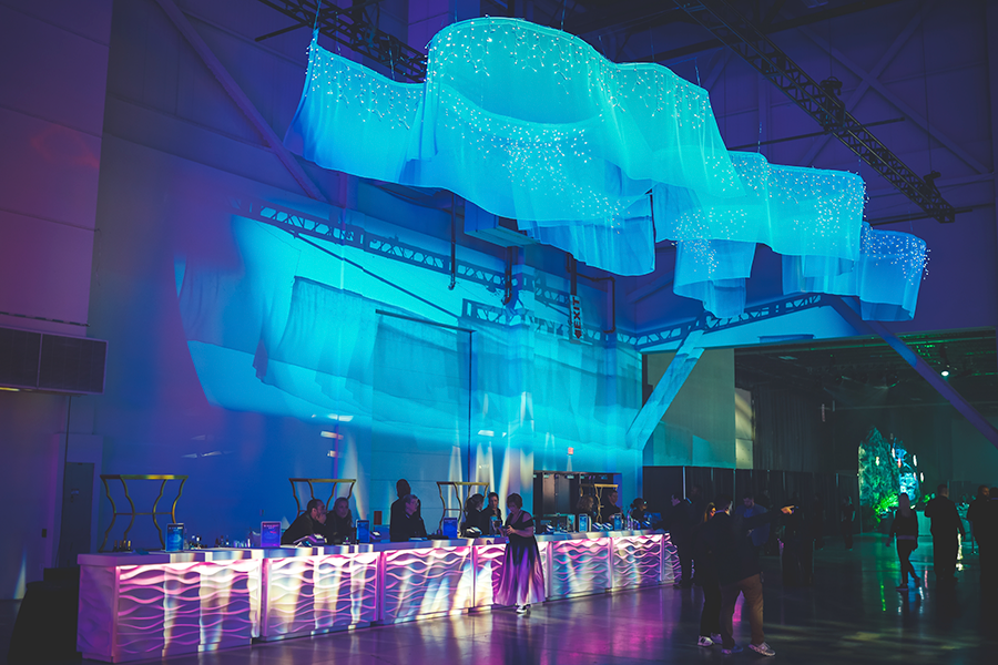 In 2023, UWM shifted gears again with a bold new concept: “Elements”. Hosted at Suburban Collection Showplace, this event brought together fire, water, earth, and air as design inspirations. Display Group designed immersive environments that included a glowing cloud lounge, a northern lights-inspired sky dome, a waterfall bar, and stylized natural installations throughout the venue. The evening closed with back-to-back performances from The Chainsmokers and Kelsea Ballerini, enhanced by DG’s custom lighting and effects.